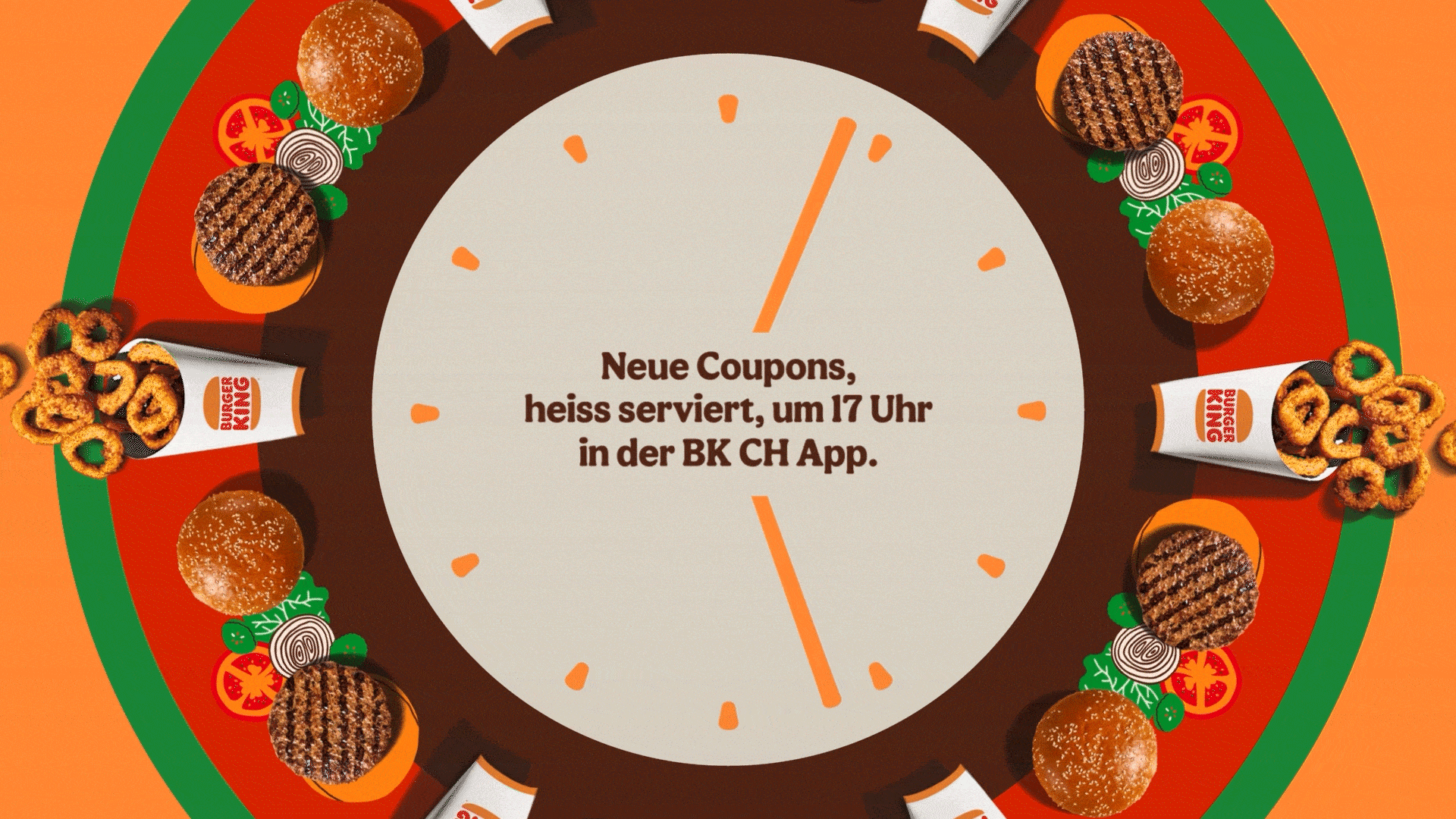 Täglich um 17 Uhr erscheinen exklusive Rabatt-Coupons in der Burger King App. Unsere Aufgabe war es, diesem wiederkehrenden Moment eine visuelle Identität zu verleihen und eine digitale Kampagne zu gestalten, die das Format kommuniziert.